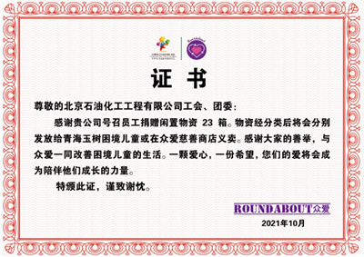 近日,北京石油化工工程有限公司收到中華少年兒童慈善救助基金會眾愛專項基金捐贈證書。感謝公司在"金秋助學"活動中為困難兒童慷慨解囊做出的善舉。