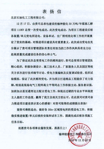 【表揚信】祝賀榆神能化煤基乙醇項目110KV總變一次受電成功