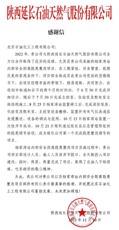 近日,北京石油化工工程有限公司收到來自陜西延長石油天然氣股份有限公司的感謝信,對我公司總承包的楊家灣站內(nèi)部安全距離隱患整改項目在建設期間精心策劃、合理安排施工、克服不利因素,保質(zhì)保量按期完成了任務目標,得到了業(yè)主的肯定。