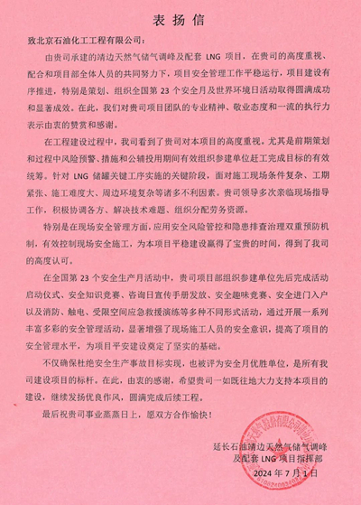 近日,由北京石油化工工程有限公司(簡稱:北油工程)總承包的延長石油靖邊天然氣儲氣調峰及配套LNG項目安全生產工作得到延長石油煉化公司肯定,項目部獲得2024年度“安全生產月”活動“先進單位”稱號,3名員工獲得“安全之星”稱號。并收到表揚信,對北油工程在項目建設期間,規范的安全管理,有序的項目建設,專業的團隊表示感謝。