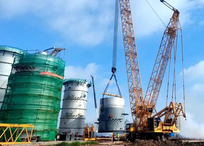 目前,DMC裝置主框架鋼結(jié)構(gòu)開始安裝,同時(shí)一塔、三塔下段裙座已吊裝就位。兩塔直徑均為8米,高度分別為66.08米和66.7米,重量為455噸和411噸,此次吊裝采用600噸履帶吊,分四段制造及四段吊裝。 為確保順利吊裝,業(yè)主、監(jiān)理、總包、施工單位召開多次吊裝專題會(huì),結(jié)合場地實(shí)際情況,研討制定吊裝方案,嚴(yán)格按照操作要求進(jìn)行施工。在各方人員密切配合下,高質(zhì)量完成了本次吊裝任務(wù)。