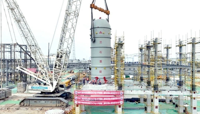 乙酸甲酯加氫反應器是該項目乙醇裝置的核心設備,最大直徑達5.7米,重621噸。該設備承擔著乙醇生產的核心任務,對控制反應條件、提升乙醇生產率以及優化工藝經濟性具有重要作用。截至目前,項目乙醇裝置整體設計已完成91.09%,采購進度達41.67%,核心設備陸續開始吊裝,土建工程多個關鍵節點也已順利完成。下一步,項目部將搶抓項目建設安裝的“黃金期”,高質量、高標準推進各項工作,確保項目既定目標如期實現。(通訊員/王超 攝/王超)